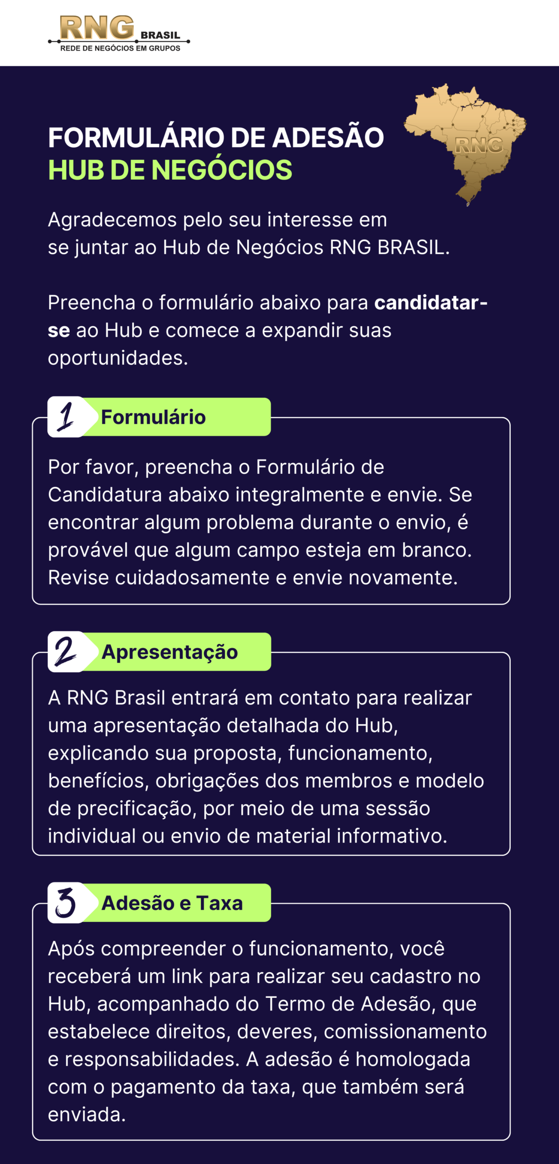 Ao enviar este Formulário de Candidatura ao Hub, você estará se candidatando a tornar-se membro. A RNG Brasil entrará em contato para apresentar, de forma detalhada, o funcionamento do Hub de Negócios, bem como os termos e condições que regem nossas políticas, regras, direitos, deveres e obrigações. Somente após a análise e plena concordância com todas as cláusulas do contrato será disponibilizado o link para pagamento da taxa de adesão, cuja quitação homologará sua entrada no Hub de Negócios.